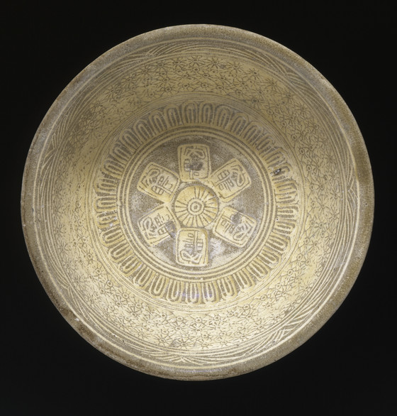 Buncheong ware; Wheel-thrown stoneware with stamped, incised and slip-filled decoration and pale green glaze