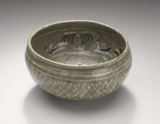 Wheel-thrown stoneware with incised and slip-filled decoration and green glaze