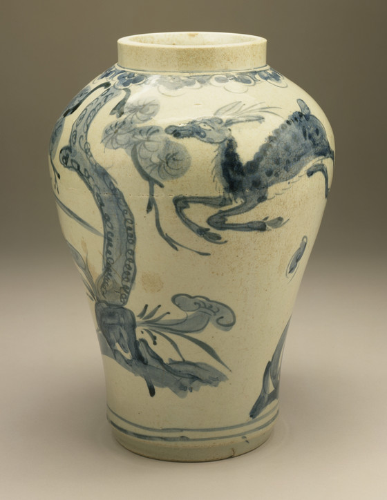 Wheel-thrown porcelain with underglaze blue painted decoration under clear glaze (cheonghwa baekja ware)