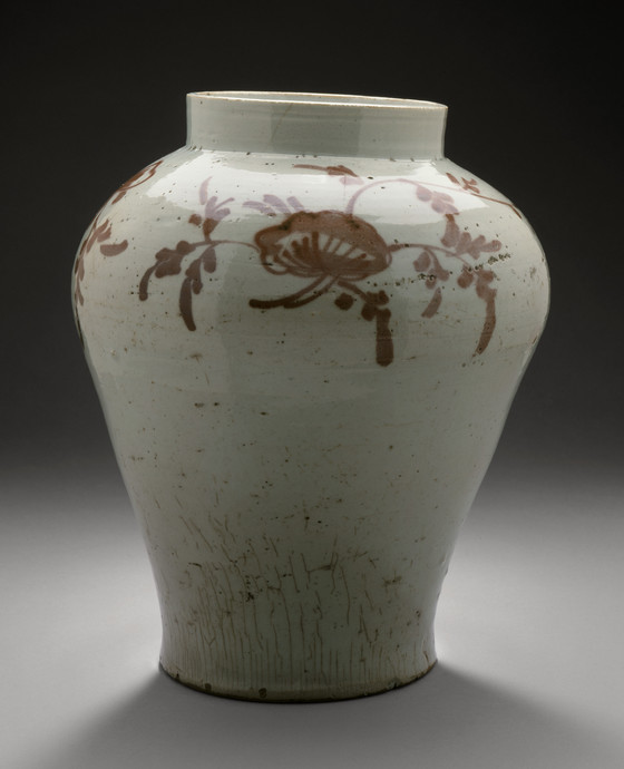 Wheel-thrown porcelain with red painted decoration under clear glaze