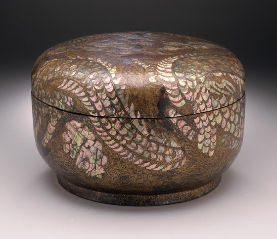 Brown lacquer with sprinkled gold on wood core with mother-of-pearl, tortoise shell, and twisted brass wire inlay