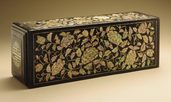Black lacquer on wood core with gold painted decoration, mother-of-pearl inlay, and metal fittings
