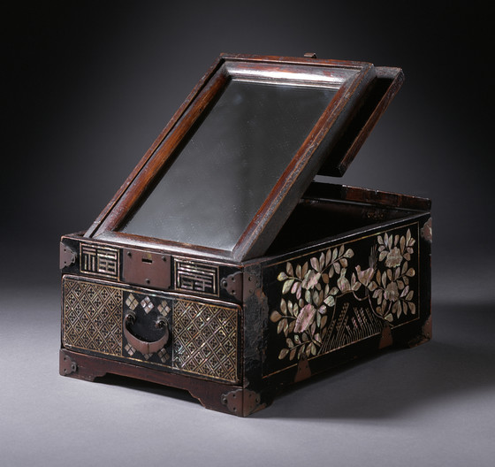 Brown lacquer on wood core with mother-of-pearl inlay, brass fittings, and silvered glass