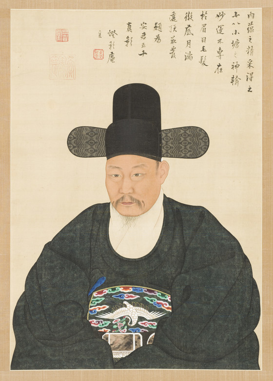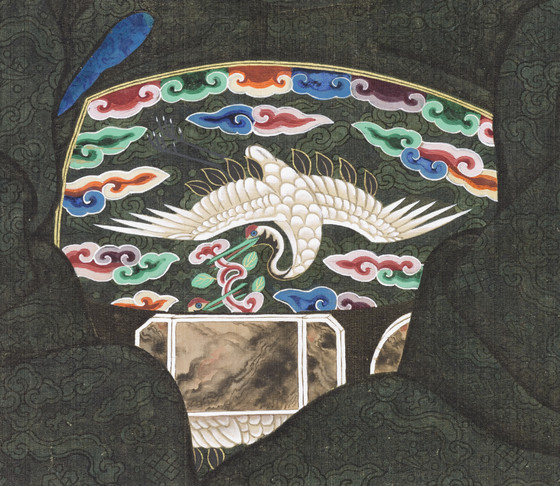 A half-length portrait, this painting depicts an official by the last name of An wearing an official hat and robe. It is apparent from the crane motif in the rank badge[1] on his robe that An was a scholar-official at the court (det. 1). Typical of Korean portrait painting, this work expresses the personality and character of the distinguished An.