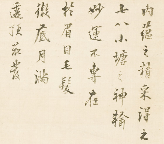 The first four lines of the inscription reflect on the portrait: “catching seven- or eight-tenths of the transcendental inner essence [of the sitter], Sodang’s marvelous skill executing the image lies not entirely on the eyebrows, eyes, and hair” (det. 4,5). In this passage, Kim Jeonghui praises Yi Jaegwan (whom he calls Sodang) for his success in capturing the spirit of the sitter.