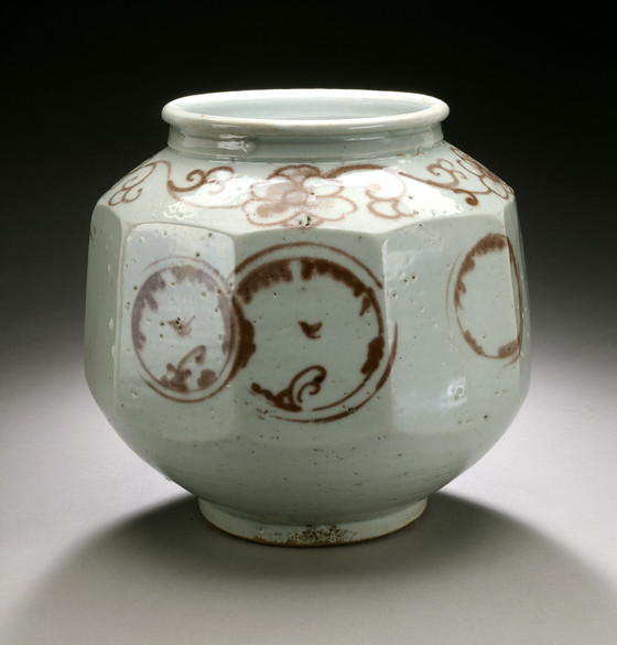Wheel-thrown and cut porcelain with red painted decoration under clear glaze