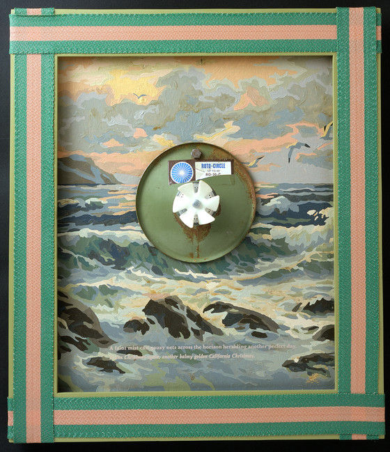 Oil on board, vinyl strapping, sprinkler head, sticker, and wood frame