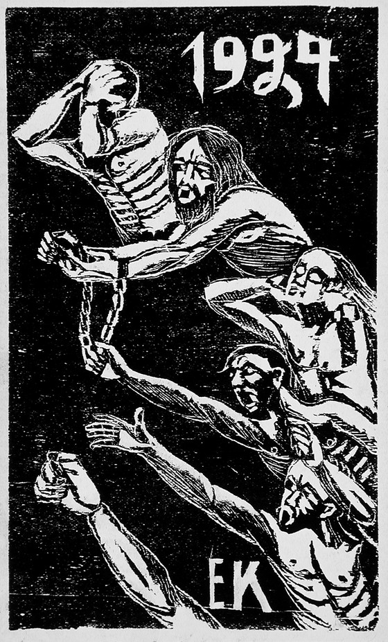 Printed material with fourteen woodcuts and two linocuts on wove paper