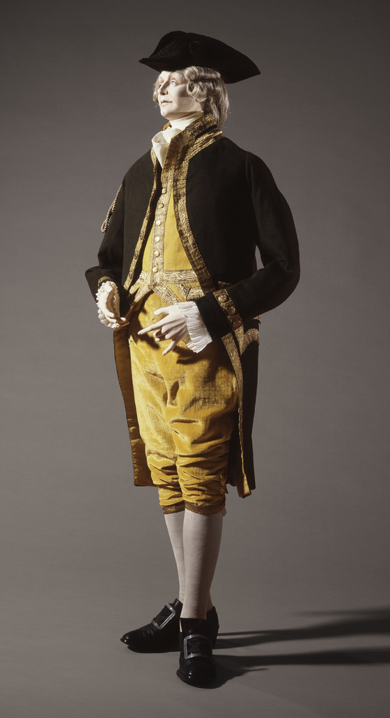 Coat: wool plain weave, fulled, with metallic ribbon, metal braid, and metal buttons; Waistcoat: wool plain weave, fulled, with metallic ribbon and metal buttons; Breeches: wool velvet with metallic ribbon and metal buttons