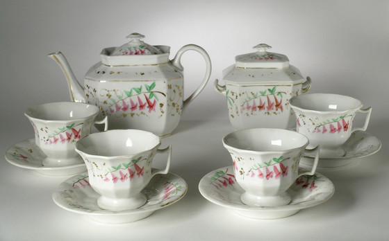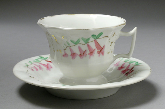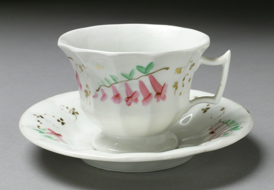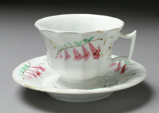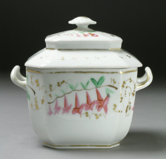 a-b) Teapot: 6 1/4 x 9 3/4 x 4 3/4 in. (15.88 x 24.77 x 12.07 cm); c-d) Sugarbox: 5 1/2 x 5 3/4 x 3 3/4 in. (13.97 x 14.61 x 9.53 cm); e-l) Cup: 2 7/8 x 4 1/4 x 3 5/8 in. (7.3 x 10.8 x 9.21 cm) each; Saucer height: 5/8 in. (1.59 cm) each; Saucer diameter: 5 3/4 in. (14.61 cm) each