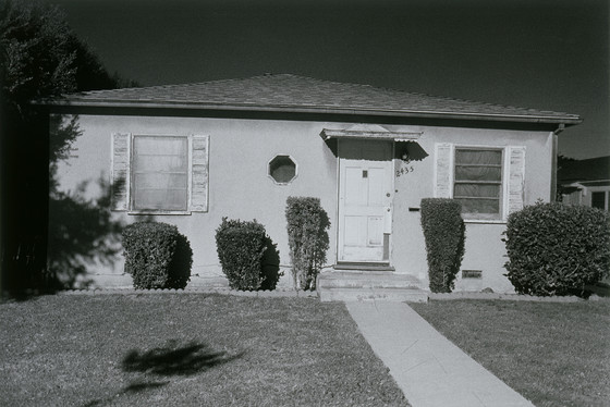 Descriptive: (front view worn house with tree shadow on front lawn and left corner of house, #2435, octagon window)