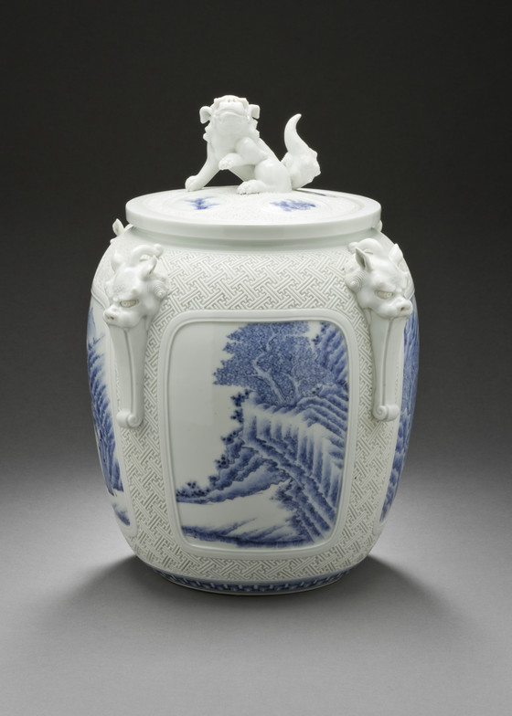 Alternate Title: 平戸三河内焼染付獅子彫山水文水指