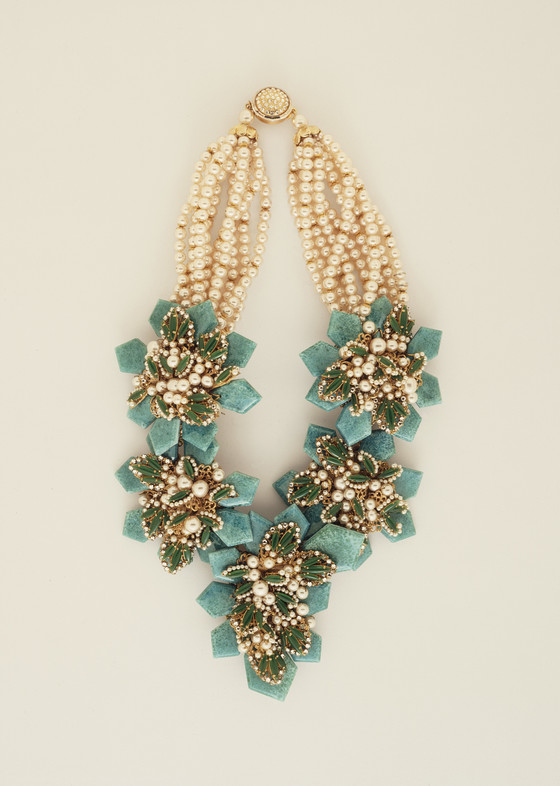 Glass faux turquoise and jade, alabaster-base faux pearls, glass seed pearls, faux diamonds, 18 kt gold-electroplated brass, silver-plated metal