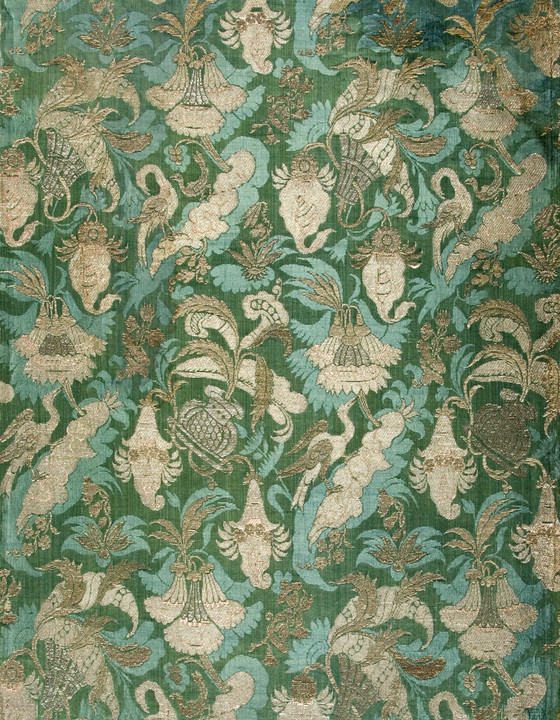 Silk damask with silk and metallic-thread discontinous supplementary weft patterning (brocade)