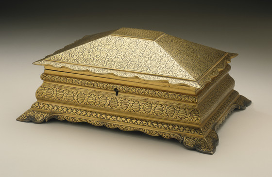 This radiant casket is made in the damascene inlay technique known as koftgari (made by beating). It features fine gold wire and gold leaf overlay hammered into patterns incised into the surface of the iron ground. The rectangular casket is surmounted by a pyramidal shaped lid with a flat crown. The primary decoration on the lid is a flowering tree, with a secondary geometric pattern displayed on the crown. The motifs featured on the horizontal registers are a flowering vine (top), large jackfruit on a scrolling vine (middle), and a series of lilies with foliate stems (bottom).