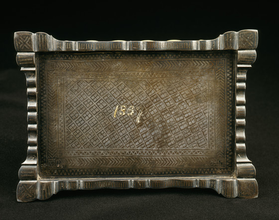 In contrast to its gold-encrusted top, the base features a silver sheet hammered over the iron surface. There is a design of cross-hatching and chevrons overlaid in silver alloy foil, which has oxidized to black. This distinctive bottom decoration is significant for helping to date such works, as by 1872 the bottoms of koftgari vessels were being finished with electro-plating. The bottom of the Los Angeles casket has a painted inscription, 1867, which is likely the date when it was made or acquired.