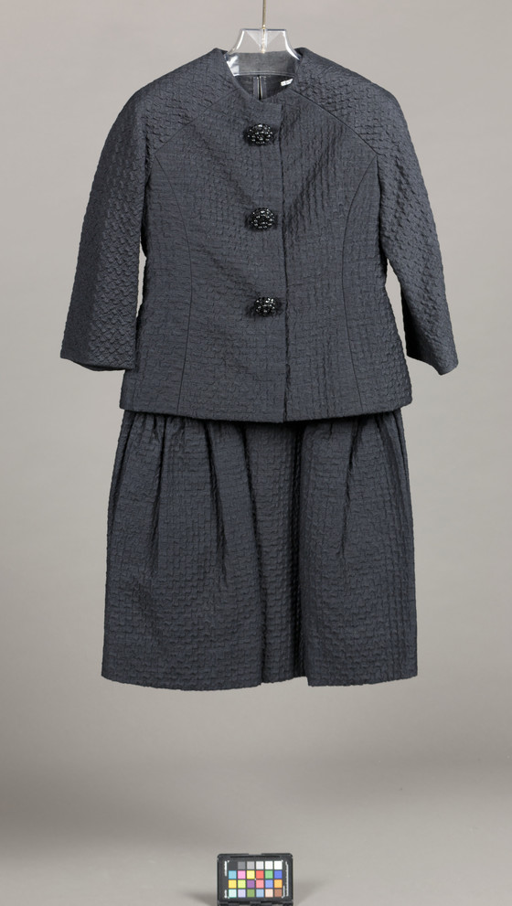 Dress: silk double cloth (cloqué); Jacket: silk double cloth (cloqué) with plastic and glass buttons