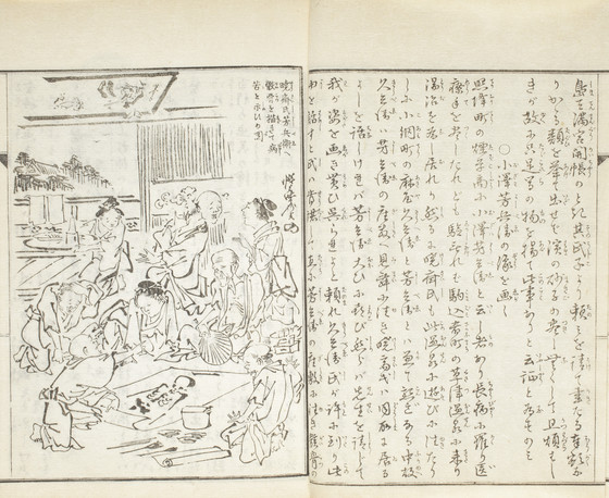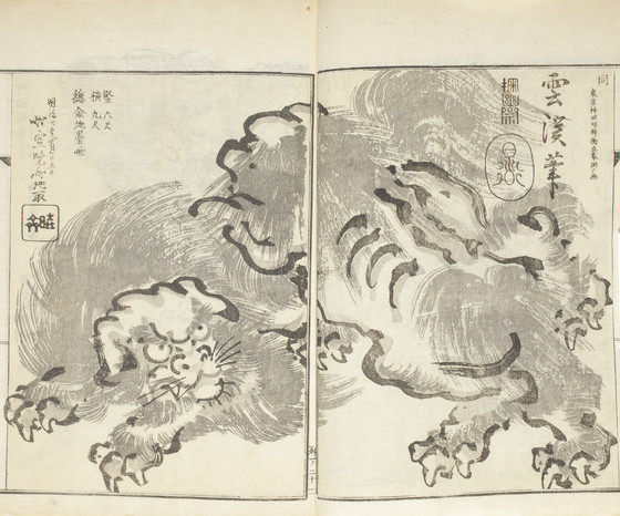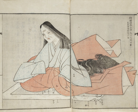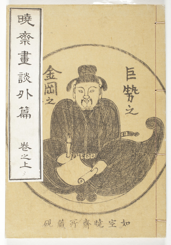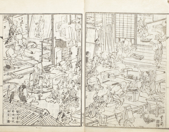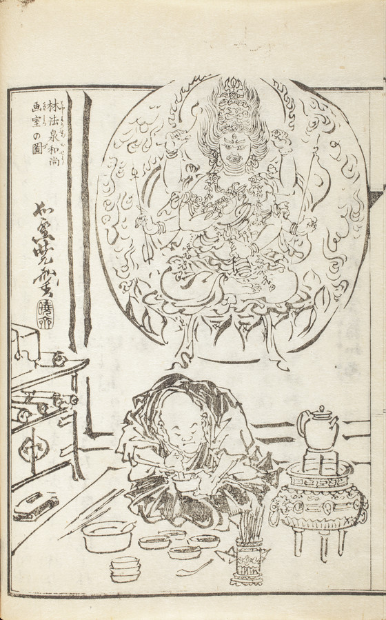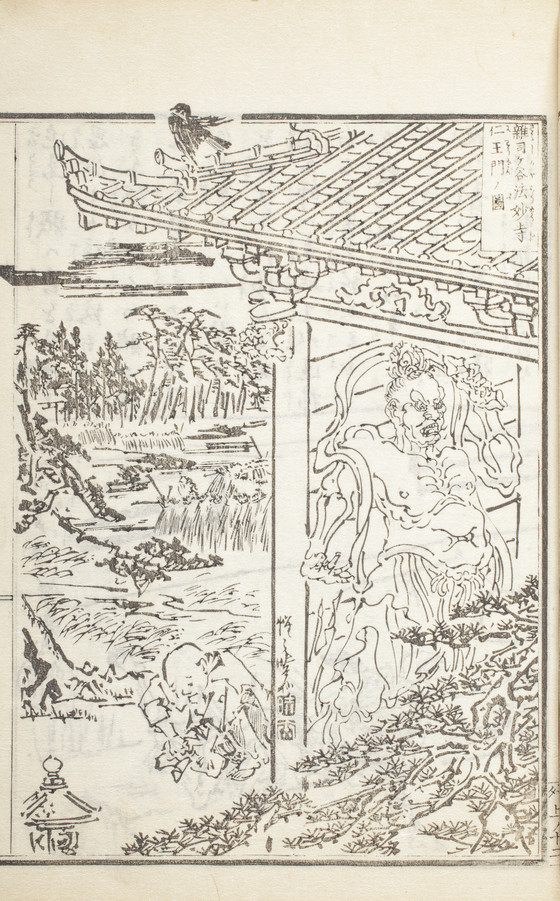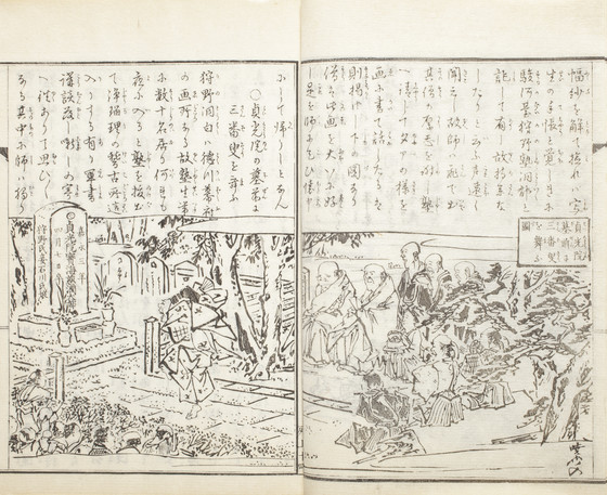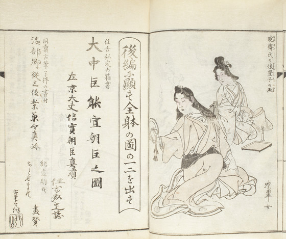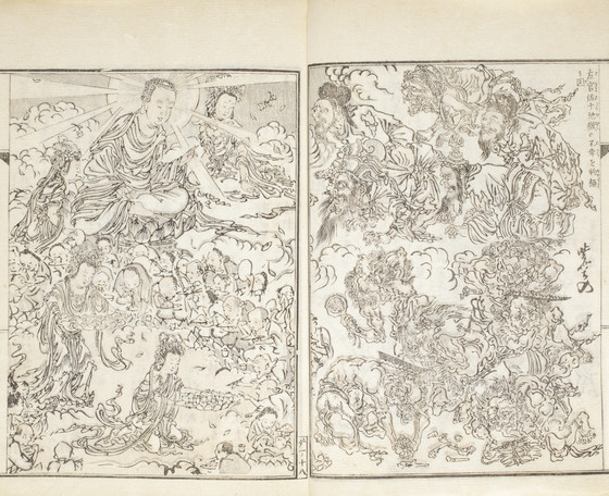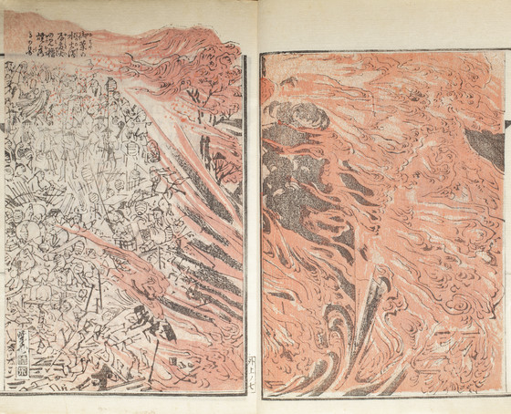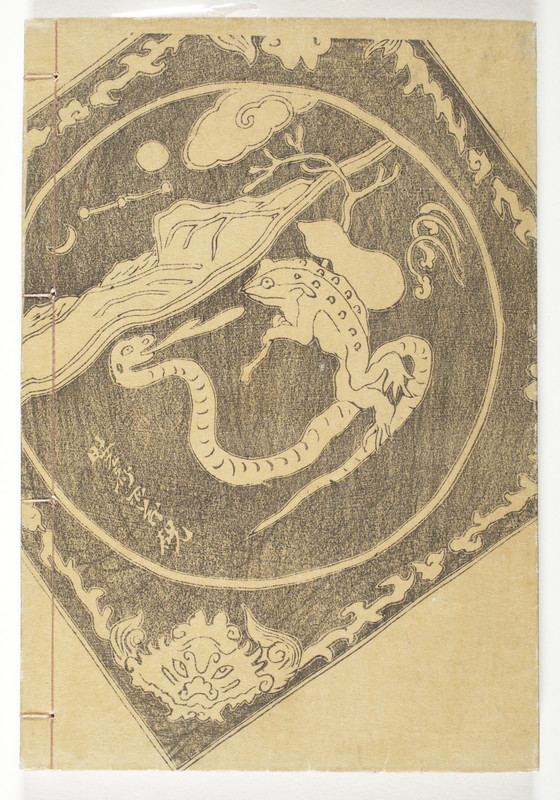 Color woodblock printed books; four volumes covered with a slip cover having woodblock printed illustration adhered to cloth