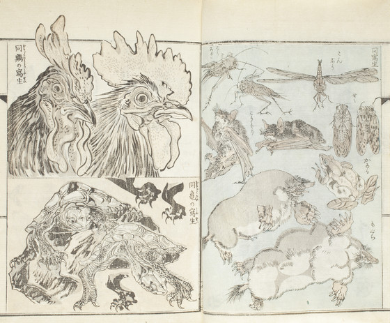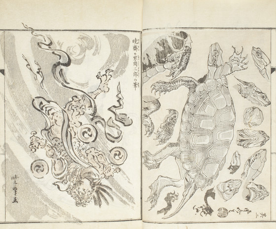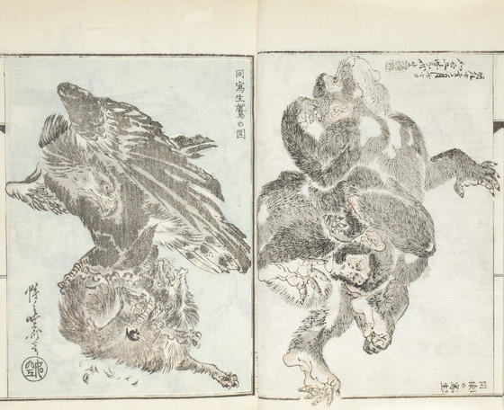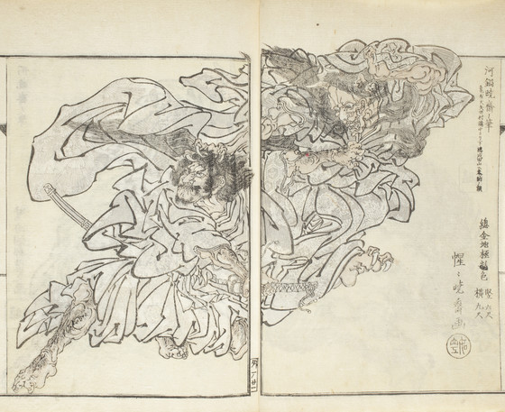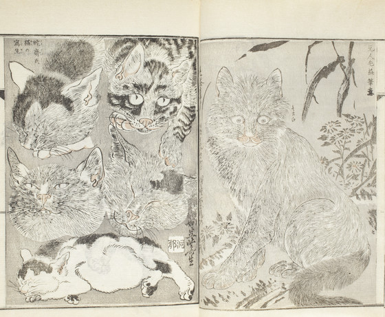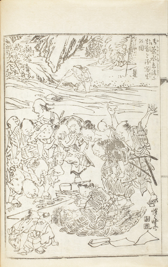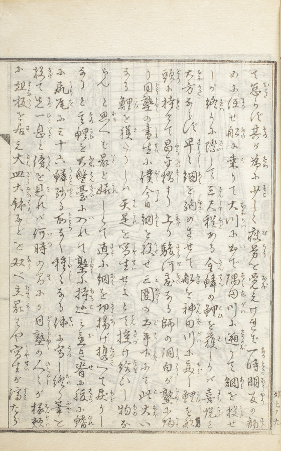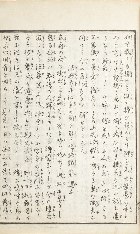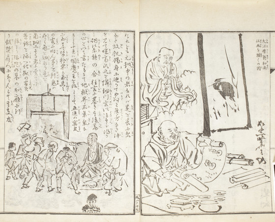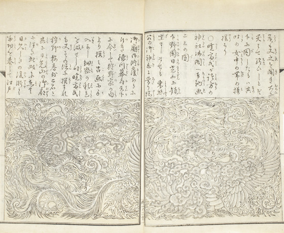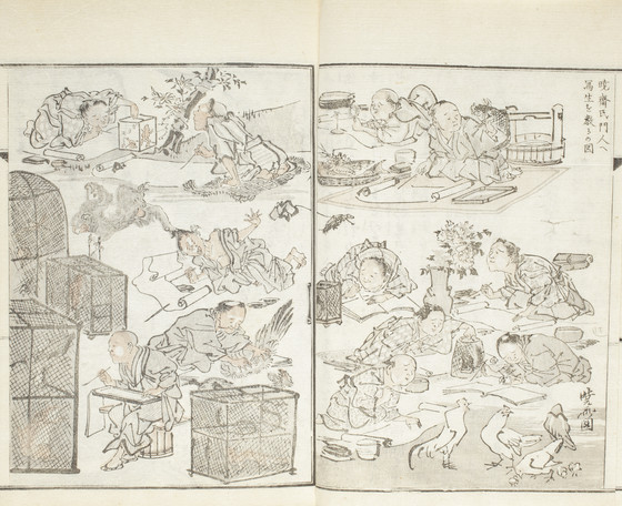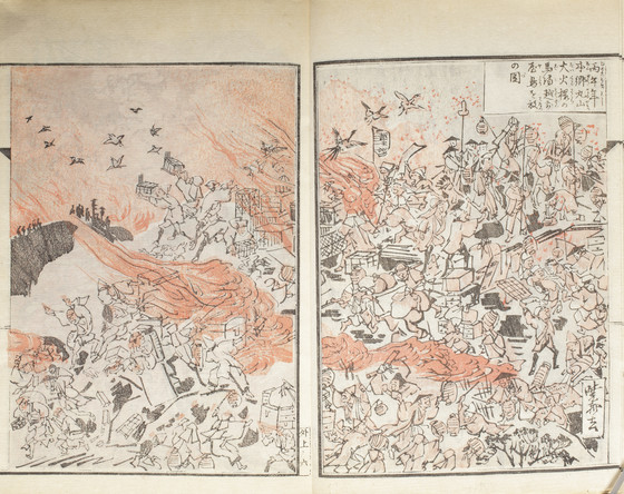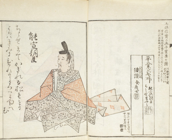 Color woodblock printed books; four volumes covered with a slip cover having woodblock printed illustration adhered to cloth