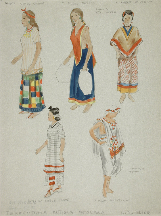 Tracing of W. du Solier's 'Ancient Mexican Costume,' Plates XXV a & b, XXVI a & b, and XXVII a