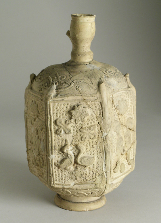Earthenware, molded with applied neck, foot and handle (now missing)