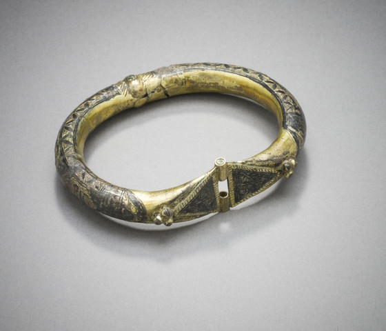 Fabricated from sheet, incised, and decorated with gilding, niello inlay, and grains