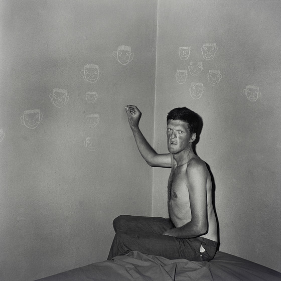 Man drawing chalk faces on wall
