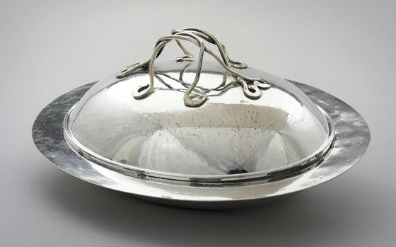 Overall: 5 x 12 x 9 3/8 in. (12.7 x 30.48 x 23.81 cm); a) Lid: 3 1/4 x 9 1/2 x 7 in. (8.26 x 24.13 x 17.78 cm); b) Dish: 1 1/2 x 12 x 9 3/8 in. (3.81 x 30.48 x 23.81 cm); c) Dish liner: 1 1/8 x 9 5/8 x 7 1/4 in. (2.86 x 24.45 x 18.42 cm)