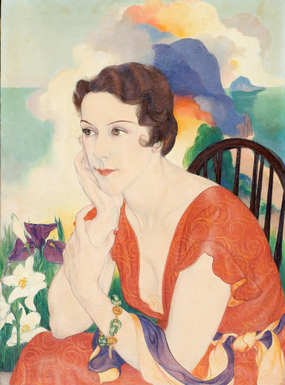 This portrait is signed and dated on the reverse with the Japanese character meaning spring and portrays Stanton Macdonald-Wright's lover Riza Royce, née Riza Maria Marks (1902-1980). Macdonald-Wright was deeply interested in the function of symbols and in myth and spirituality, and many such references surround his sensitive depiction of Royce. At the left are white lilies, symbols of purity and virtue, and irises, which are named for Iris, messenger of the gods in Greek mythology and the personification of the rainbow. The colors of the rainbow appear behind Royce's head in a mountainous landscape dominated by peaks of blue-violet, "the introspective, the inspirational color." The pattern of the red silk dress she wears repeats the yin-yang symbol, which represents the intertwining of the female principle, yin, with the male principle, yang, in Eastern philosophy. An actress of some renown, Royce had been married to prominent Hollywood producer Josef von Sternberg, and she and Macdonald-Wright were involved from the late 1920s through 1933. The increasing seriousness of his relationship with Royce impelled Macdonald-Wright to leave Los Angeles in May of 1932 for New York, where he joined Royce and painted this portrait.