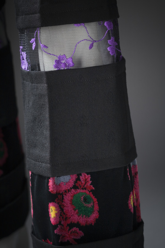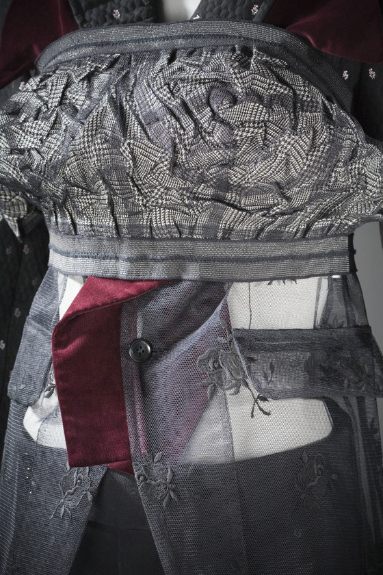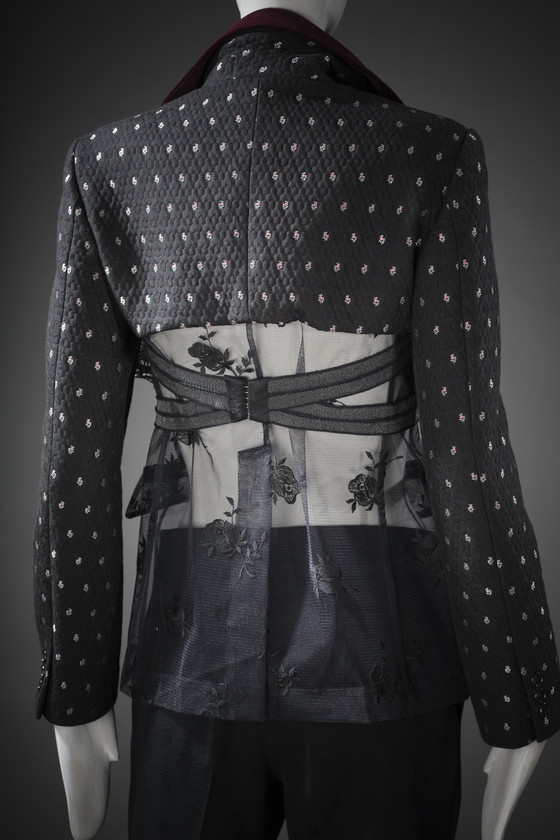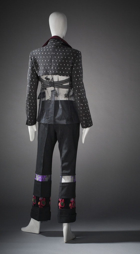 Jacket: cotton/rayon brocaded doublecloth, cotton velveteen, nylon net with rayon and polyester embroidery; Pants: wool brocaded twill, cotton velveteen, nylon net with rayon and polyester embroidery; Bra: wool twill, nylon net, elastic; Socks (purple): wool/Lurex knit; Socks (black): wool/Lurex knit