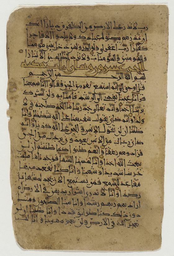 Page from a Manuscript of the Qur'an (71:26-28, 72:1-13; 72:13-28, 73:heading and bismillah)
