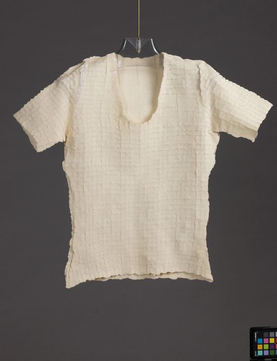 Polyester plain weave, polyurethane; transfer-printed and pleated, with heat- and pressure-set pleats