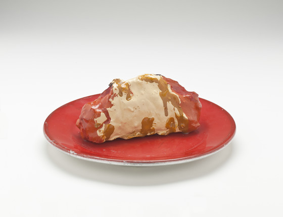 a) Pastry: 2 5/8 x 5 3/8 x 2 in. (6.67 x 13.65 x 5.08 cm); b) Plate: 7/8 x 8 1/8 in. (2.22 x 20.64 cm); Overall: 6 1/2 x 11 3/8 x 9 1/2 in. (16.51 x 28.89 x 24.13 cm)
