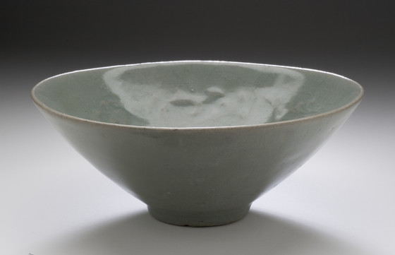 Wheel-thrown stoneware with carved decoration and celadon glaze