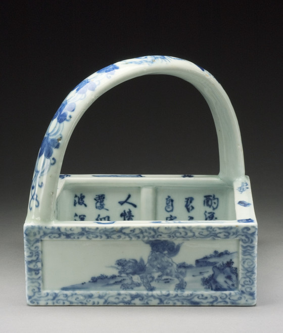 Alternate Title: 平戸三河内焼き染付詩と山水に獅子文四角手鉢