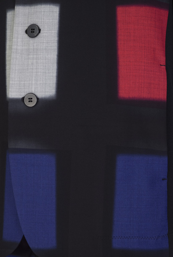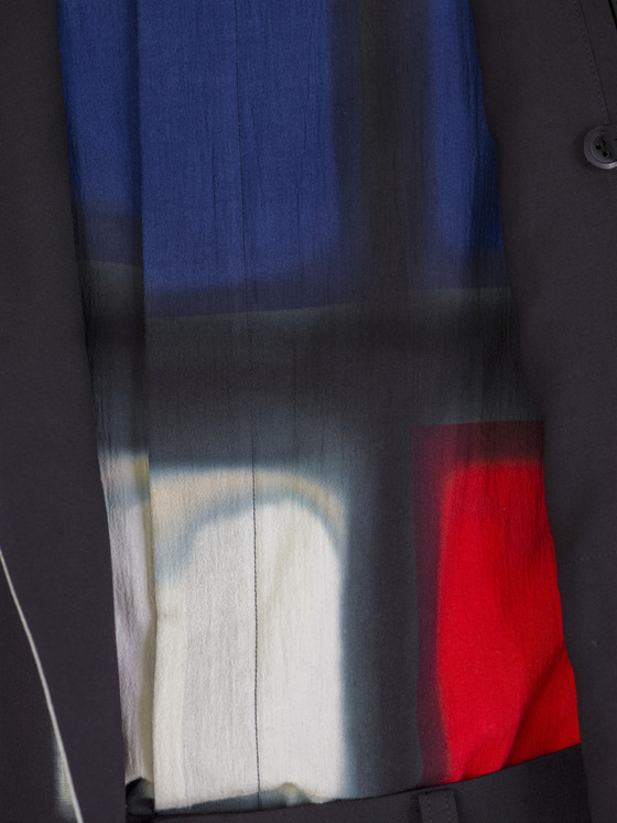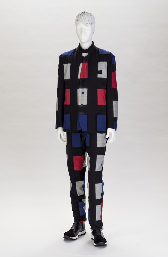 Jacket and Pants: wool plain weave, clamp-resist dyed (itajime) and printed (nassen); Shirt: cotton crepe, clamp-resist dyed (itajime) and printed (nassen); Shoes: leather, elastic, and synthetic materials