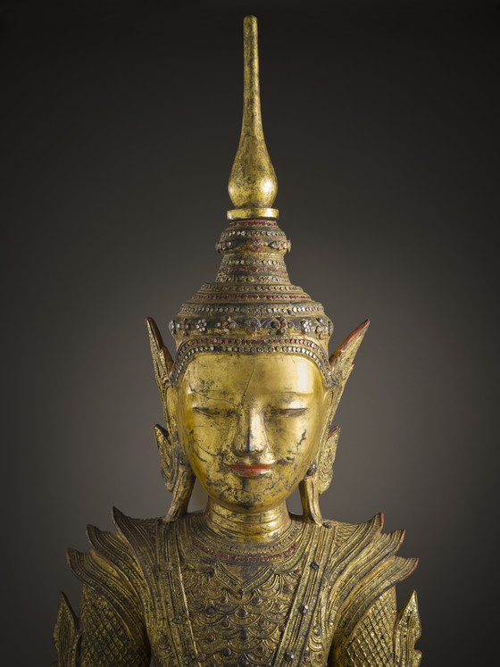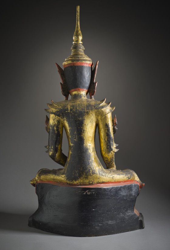 Wood with dry lacquer, gold leaf, and inlaid with foil-backed glass