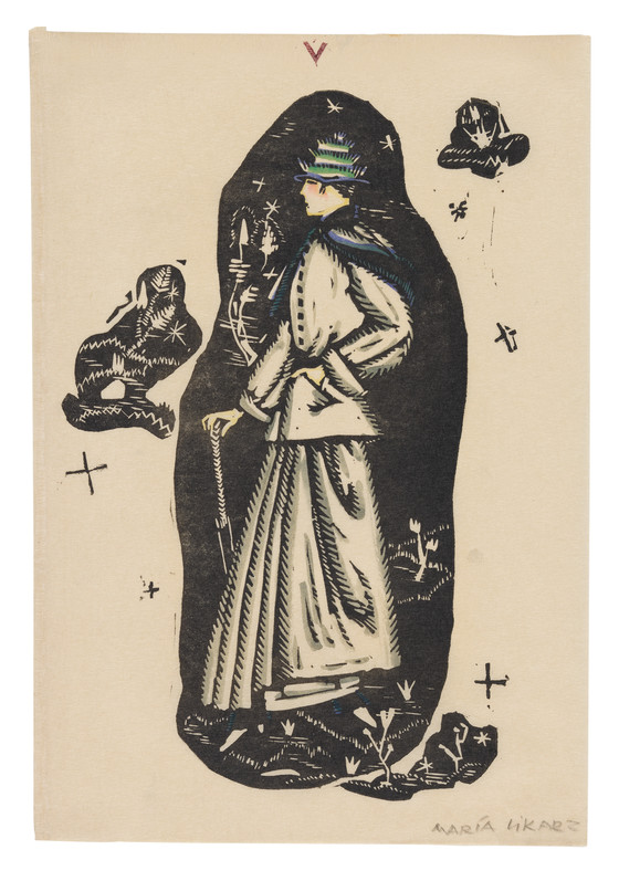 Descriptive: Woman in profile wearing hat and cape with umbrella