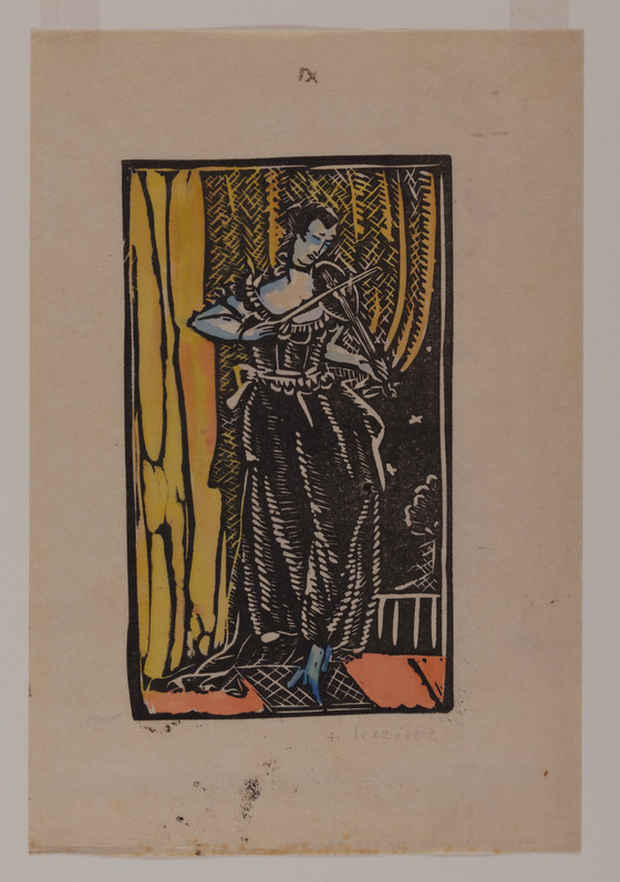 Linoleum cut, ink and watercolor on paper