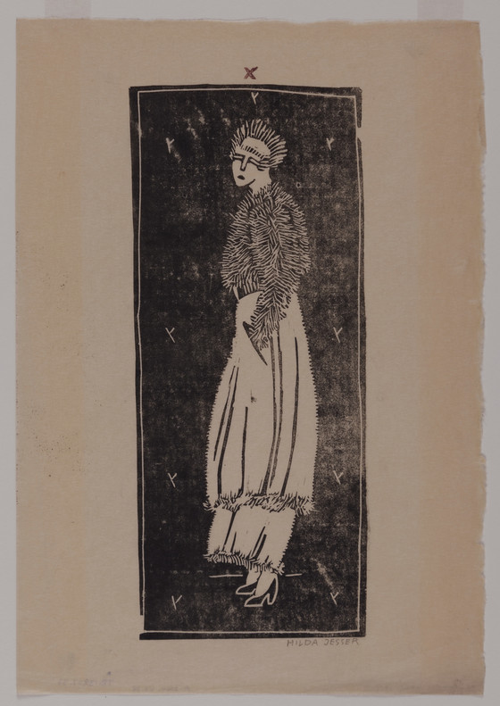 Descriptive: Woman with short fuzzy coat and two-tiered skirt with fringe