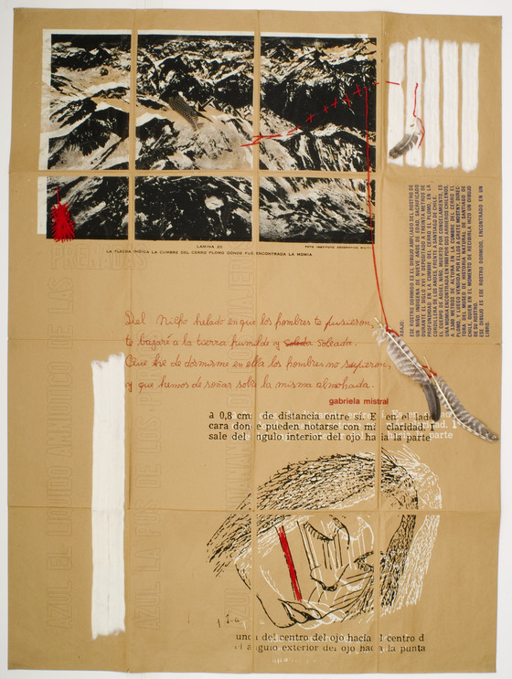 Paint, feathers, ink, cotton, wood and photo silkscreen on wrapping paper