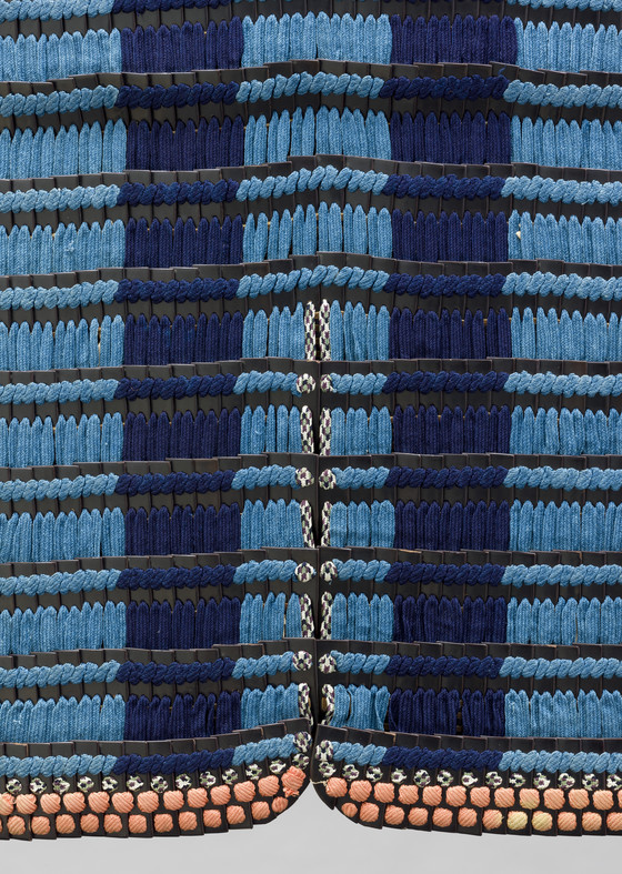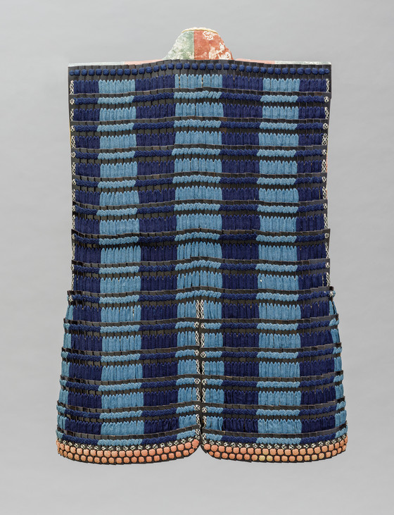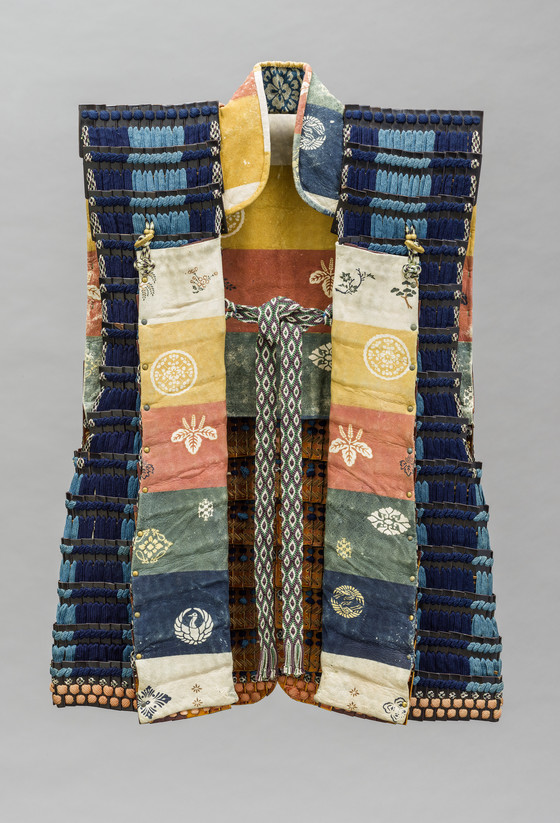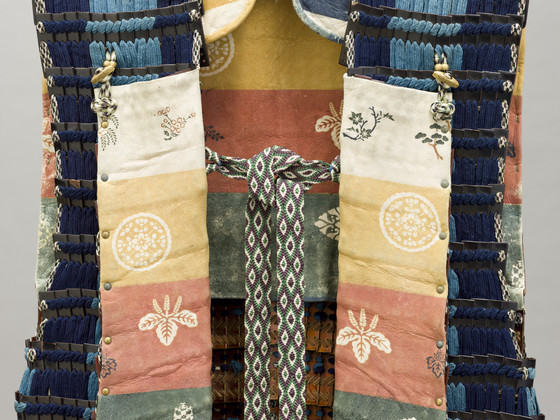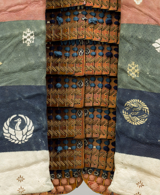 Lacquered leather (iyo-zane), stenciled paste-resist-dyed leather, silk braids (kumihimo), and gilt metal