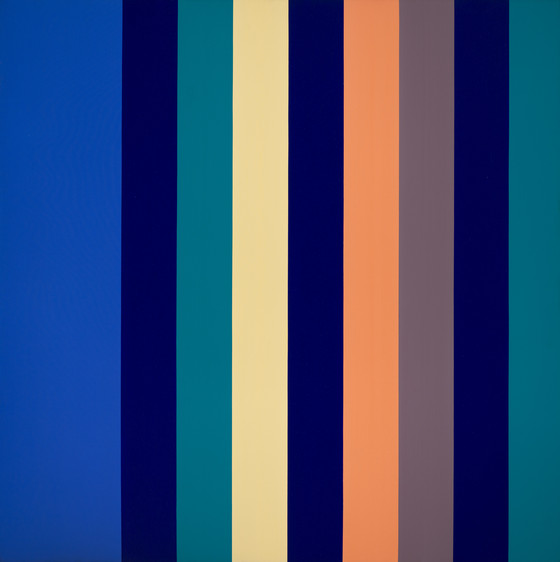 Acrylic No. 13 is a meticulously crafted canvas that illustrates Sanín’s exploration of color as subject. In the work, Sanín juxtaposes three bands of rich navy between alternating chromatic pairs. Though the navy is consistent, its positioning between the variably warm and cool bands of color affects the viewer’s perception. The artist’s use of broad bands and pure intense color can be related to the formal experimentations of the New York-based artists Barnett Newman (1905–1970) and Ellsworth Kelly (b. 1923), who were highly regarded hard-edge and color field painters.