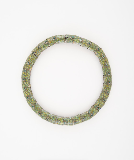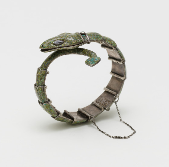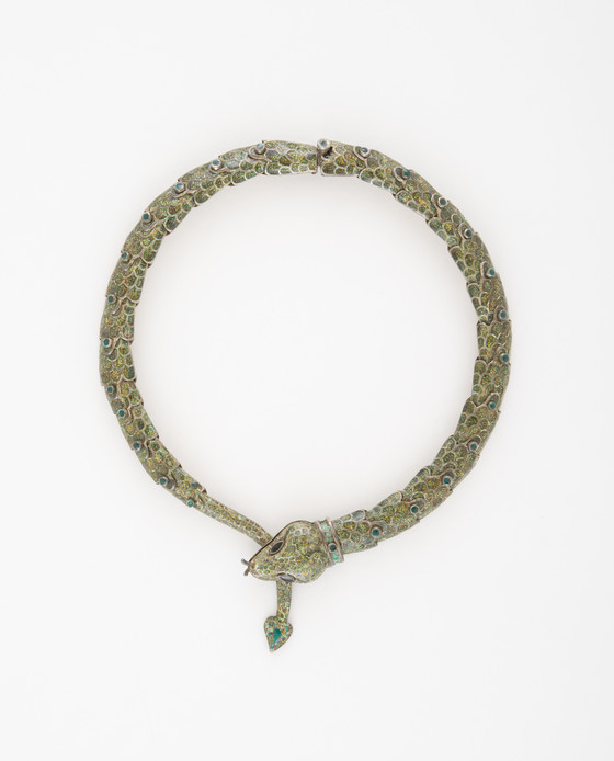 a) Necklace: 15 3/4 × 1 1/2 in. (40.01 × 3.81 cm); b) Bracelet: 6 3/4 × 5/8 × 3 in. (17.15 × 1.59 cm); Bracelet diameter (closed): 3 in. (7.62 cm); c) Belt with snake length: 14 in. (35.56 cm); Belt with snake diameter (closed): 57 1/4 in. (18.42 cm); d) Belt extension length: 17 in. (43.18 cm)