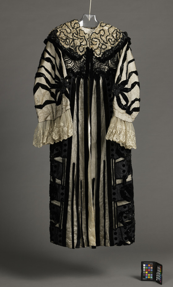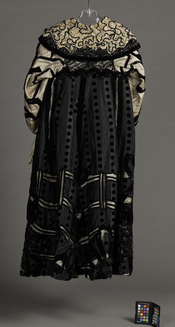 Silk satin, silk net, voided silk velvet, silk velvet ribbon, cotton lace, metallic glass beads, paste stones.