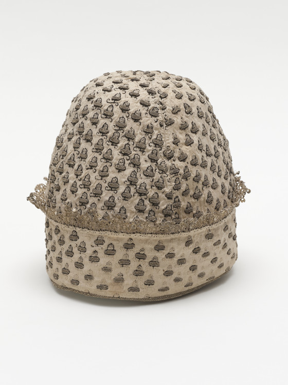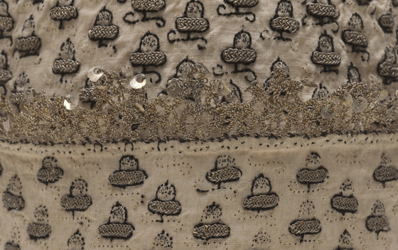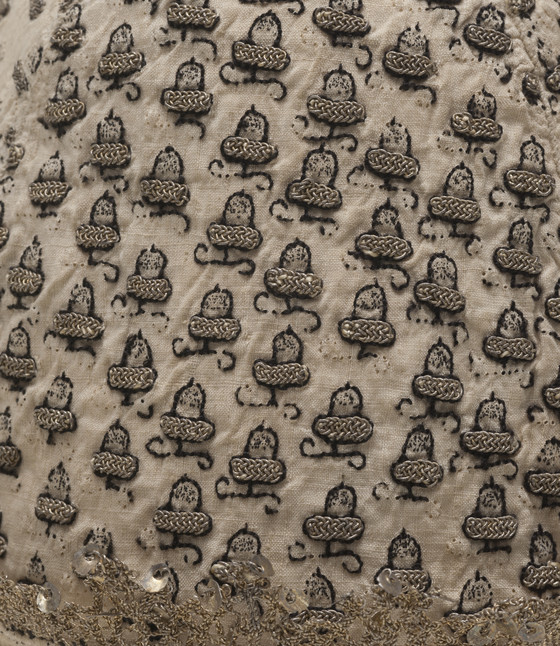 Linen plain weave with silk and metallic-thread embroidery, metallic lace, and metal sequins