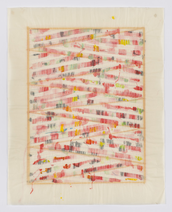 Acrylic, colored pencil, and masking tape on two layers of tracing paper