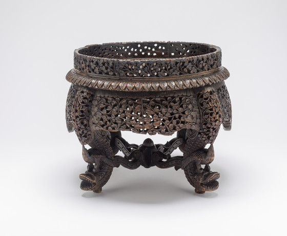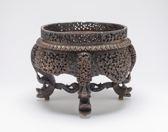 This low stand, perhaps meant to support a potted plant, has a recessed top with a pierced foliate collar. A band of pendent acanthus leaves encircles the shoulders, beneath which are a band of lappets and a large overhanging fringe of openwork foliage. The stand is supported by four opposing feet connected with floral brackets and a bud-shaped junction. The demonstrative feet are in the form of four stylized eels or serpents, each with an open mouth displaying sharp teeth and a scaled body undulating upward. A bird stands on each head with its neck craned to peck at the drooping vegetation.