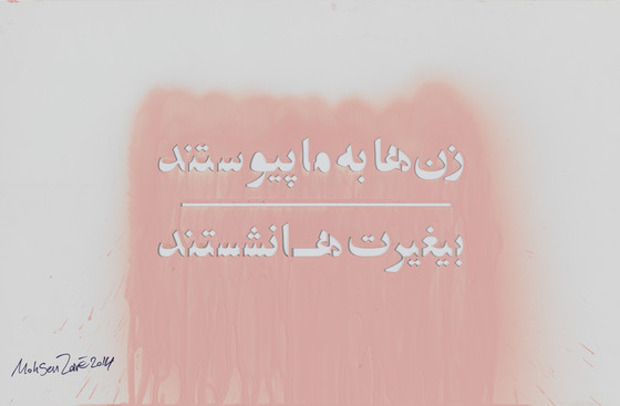 Zare’s interest in the slogans, however, is not purely nostalgic. Shortly after the revolution, the newly formed government of the Islamic Republic suppressed all forms of the opposition, erasing the visibility of the slogans in the process. Zare notes, however, that the phrases and the ideas behind them remained in people’s minds, and his series draws attention to unsettled issues from the revolution that linger in the present day. Their endurance is reaffirmed in the stencil-like function of the prints. The paint that drips from the letters implies the stencil-prints have been used to emblazon their message, reactivating their revolutionary potential. Zare’s series captures the historical power of words to propel a revolution and, perhaps, to realize a revolution after the Revolution.