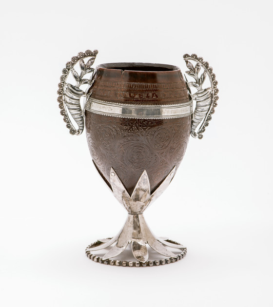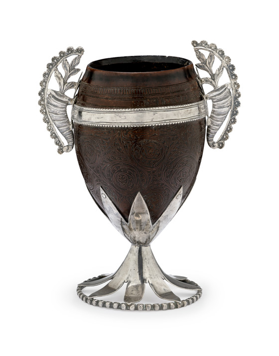Polished and engraved coconut shell and silver